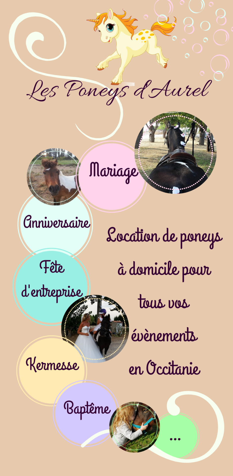 Comprend les Poneys avec matériels (casques, selles, brosses) avec ou sans animation, 50km aller/retour inclus dans le tarif, au départ de Junas 30250. Location au minimum de 2 poneys pour 2h. Demandez votre devis personnalisé par mail à lesponeysdaurel@hotmail.fr